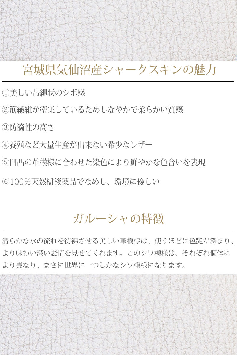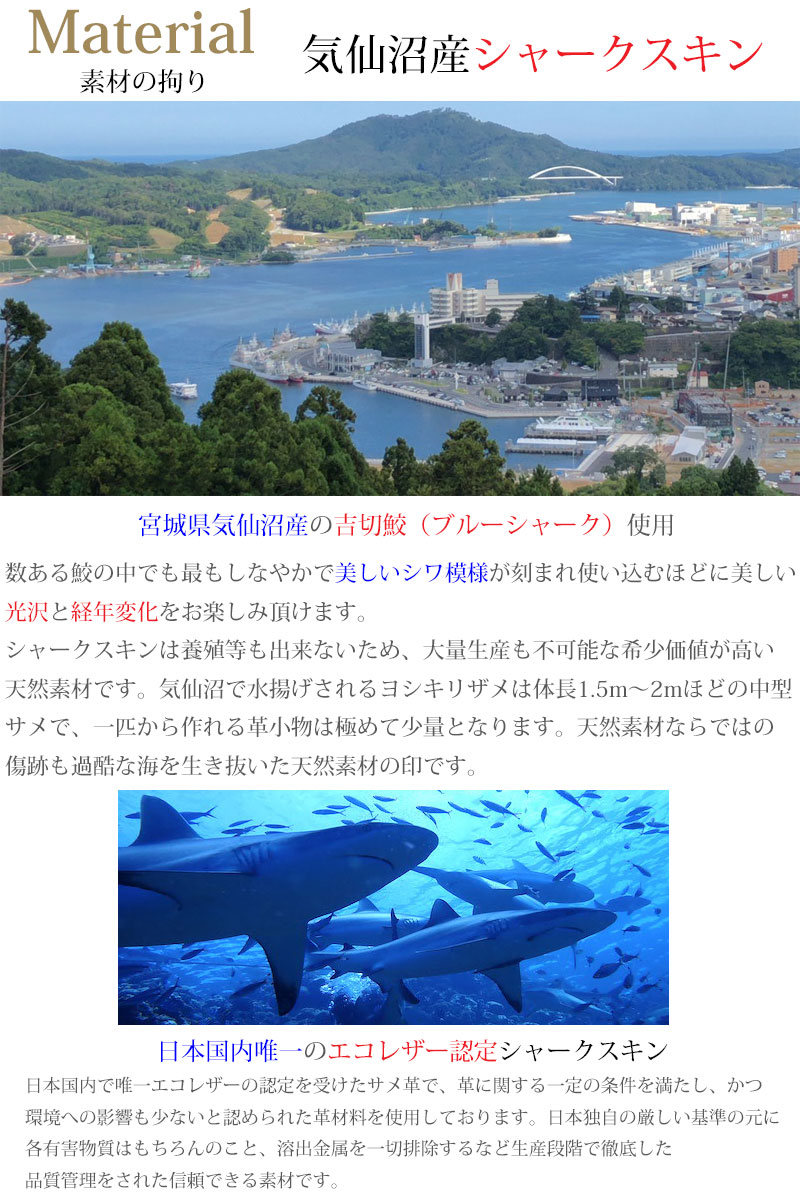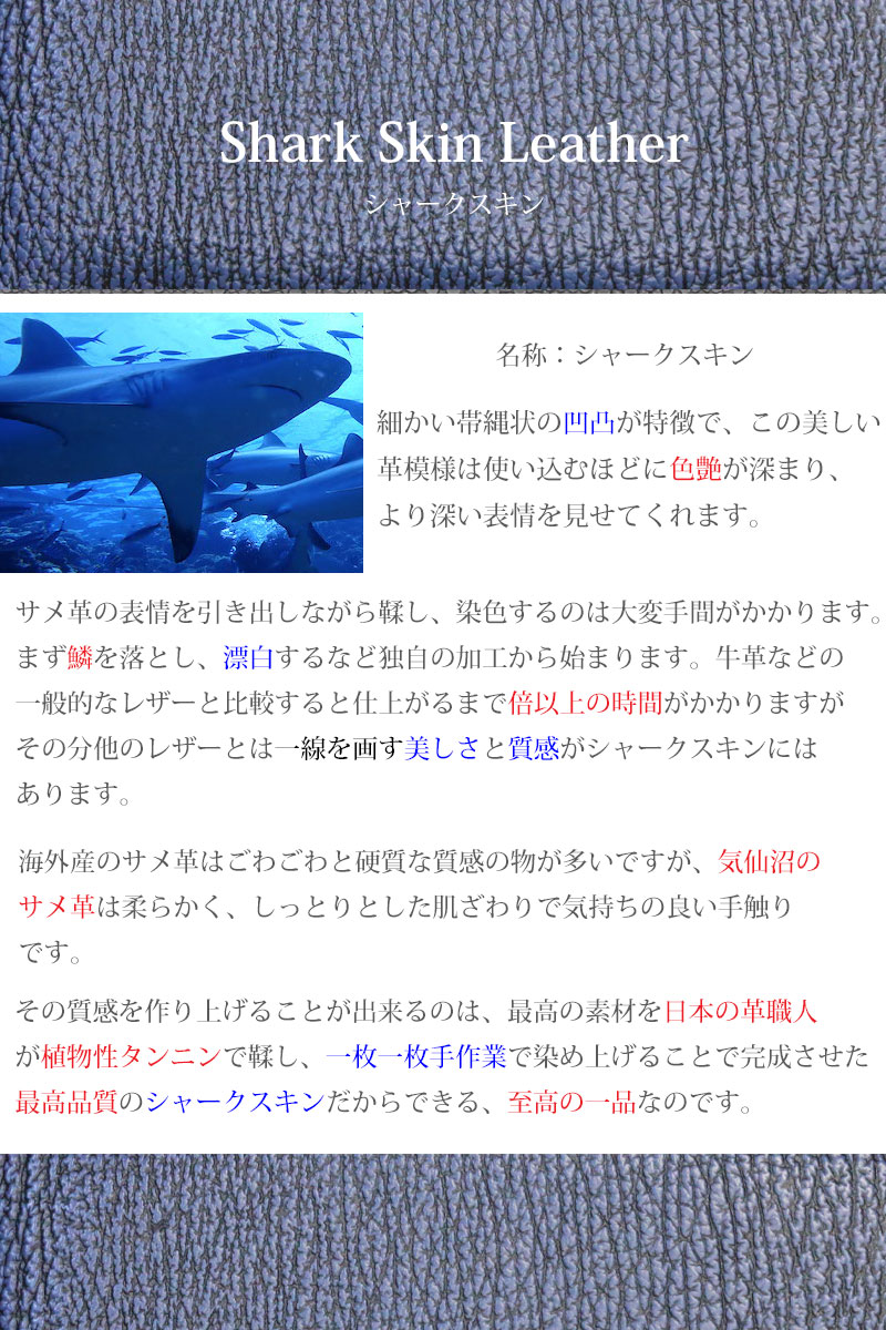 シャークスキンは、なめし加工、染色加工が難しく、革として仕上げるのが大変で、希少な革になっております。 表面は耐久性、耐水性にもすぐれ、使い込むほど、艶、光沢がまして行きます。 ガンガン使って頂き、シャークスキン特有の艶、光沢をお楽しみください!!宮城県気仙沼産のシャークスキンでしか出せない質感と柔らかさをご堪能ください。