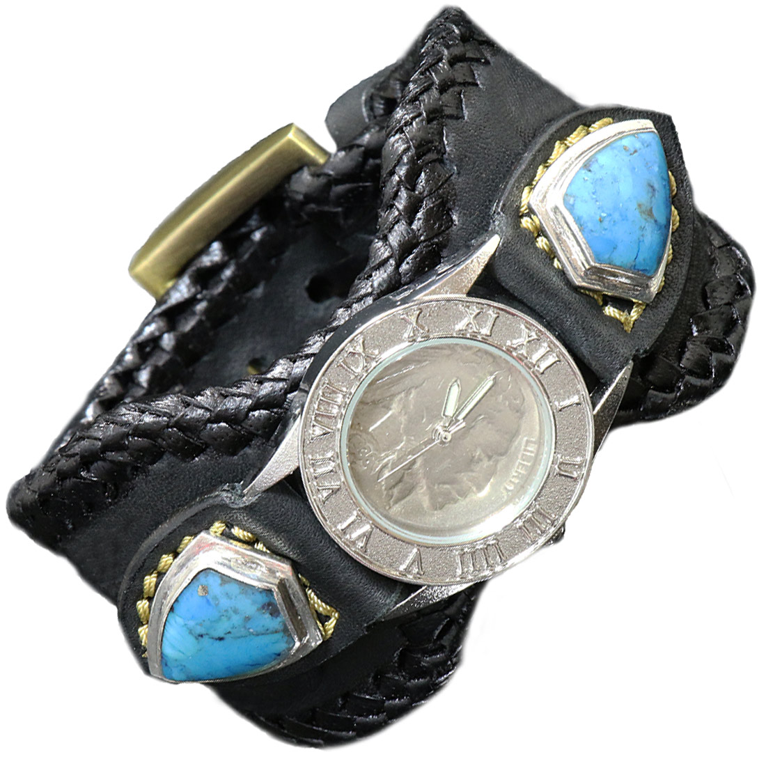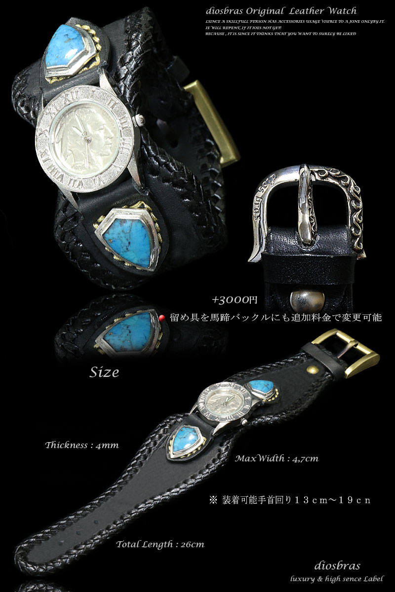 diosbras-ディオブラス- 本革サドルレザーカービング カスタムウォッチ レザーウォッチ ターコイズ コンチョ 腕時計 シルバー925 ヌメ革 バイカー 牛革時計 インディアン バッファロー フェザー 黒 ブラック