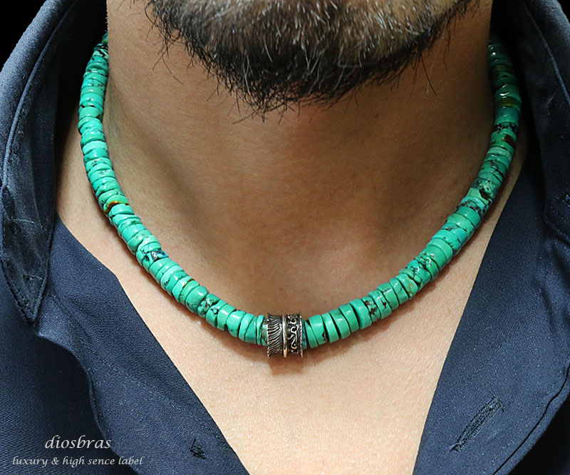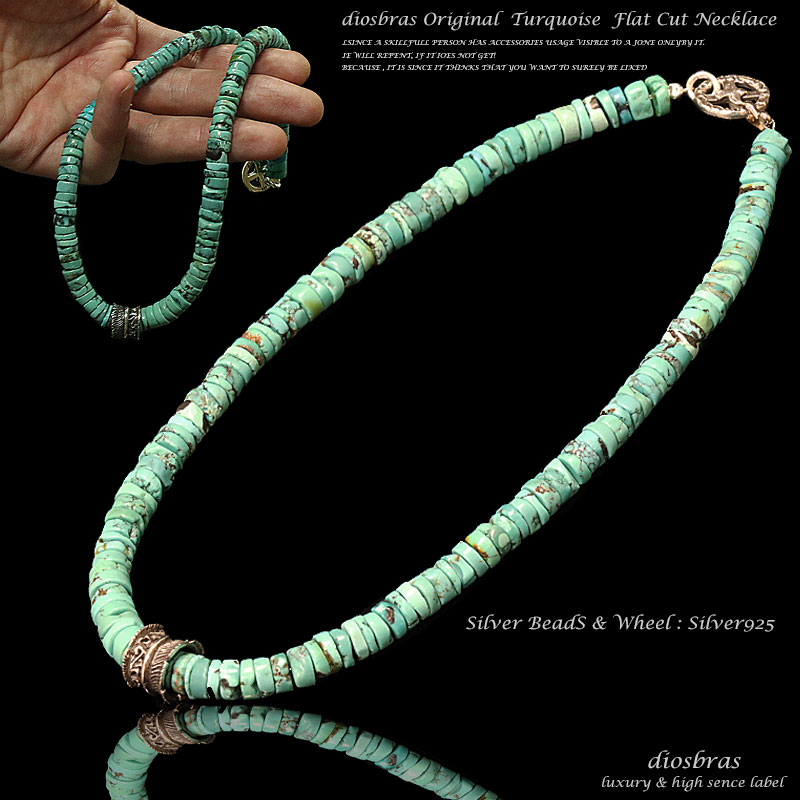 天然ターコイズの色合いと存在感を生かせるよう平面カットを連ね、留め具にホイールや、シルバービーズ等を配し組み合わせた最強ネックレスです。ホイールが2種類からご選択頂けます。