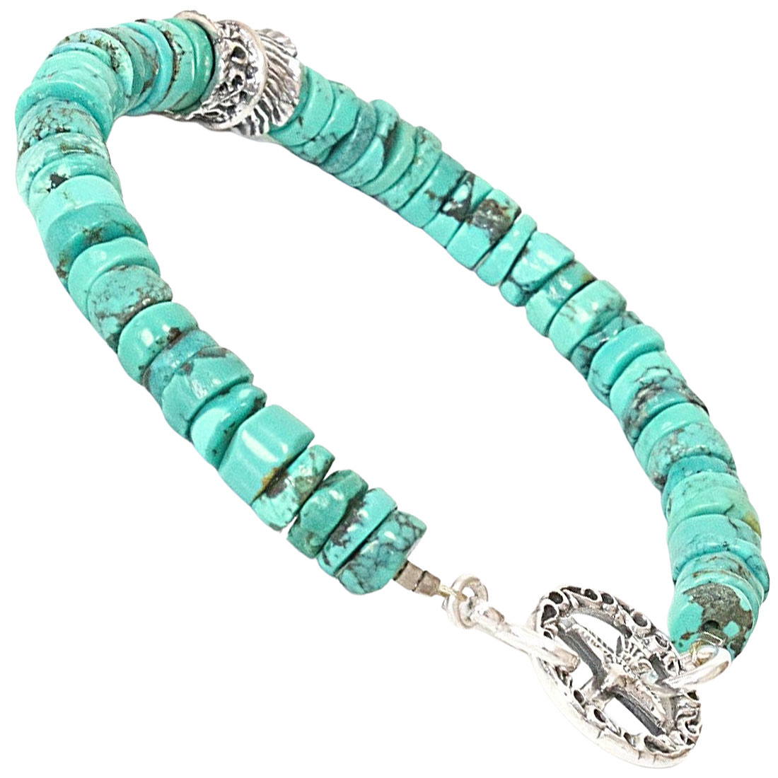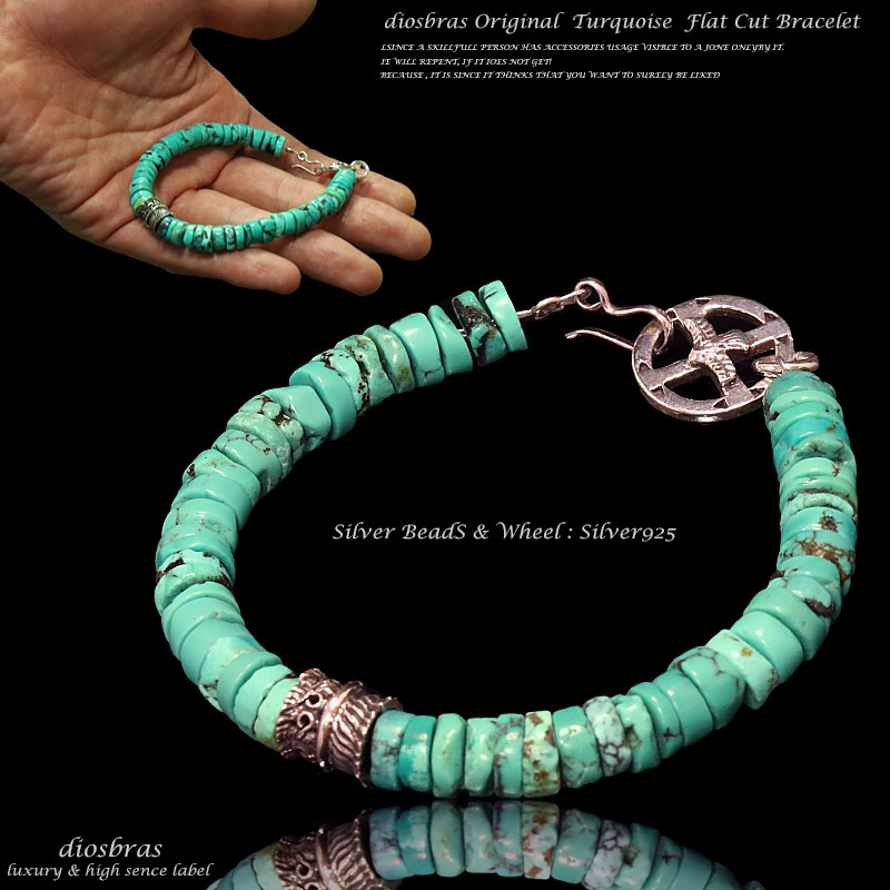 天然ターコイズの色合いと存在感を生かせるよう平面カットを連ね、留め具にホイールや、シルバービーズ等を配し組み合わせた最強ブレスレットです。ホイールが2種類からご選択頂けます。