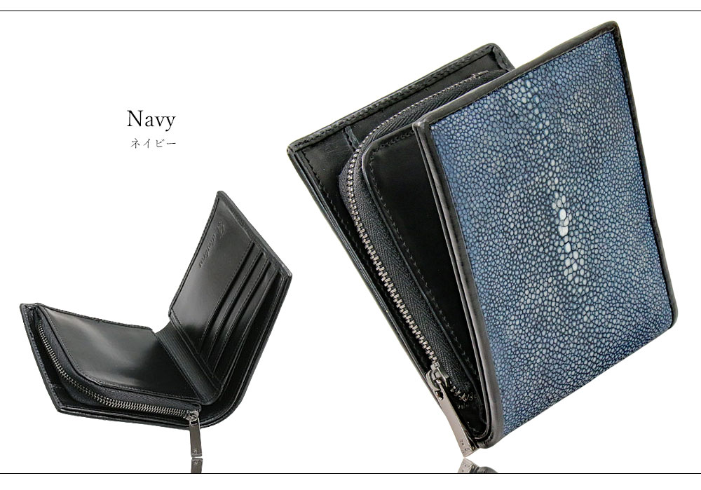 メンズ二つ折り レザーウォレット 本革 スティングレイ エイ革 ガルーシャ シンプルウォレット スリム 薄い 短財布 レザーウォレット 革財布 皮財布 ショートウォレット ウォレット 紳士財布 婦人財布 サイフ 二つ折り財布 メンズ レディース 財布 L型コインファスナー [WJE-18-4C]