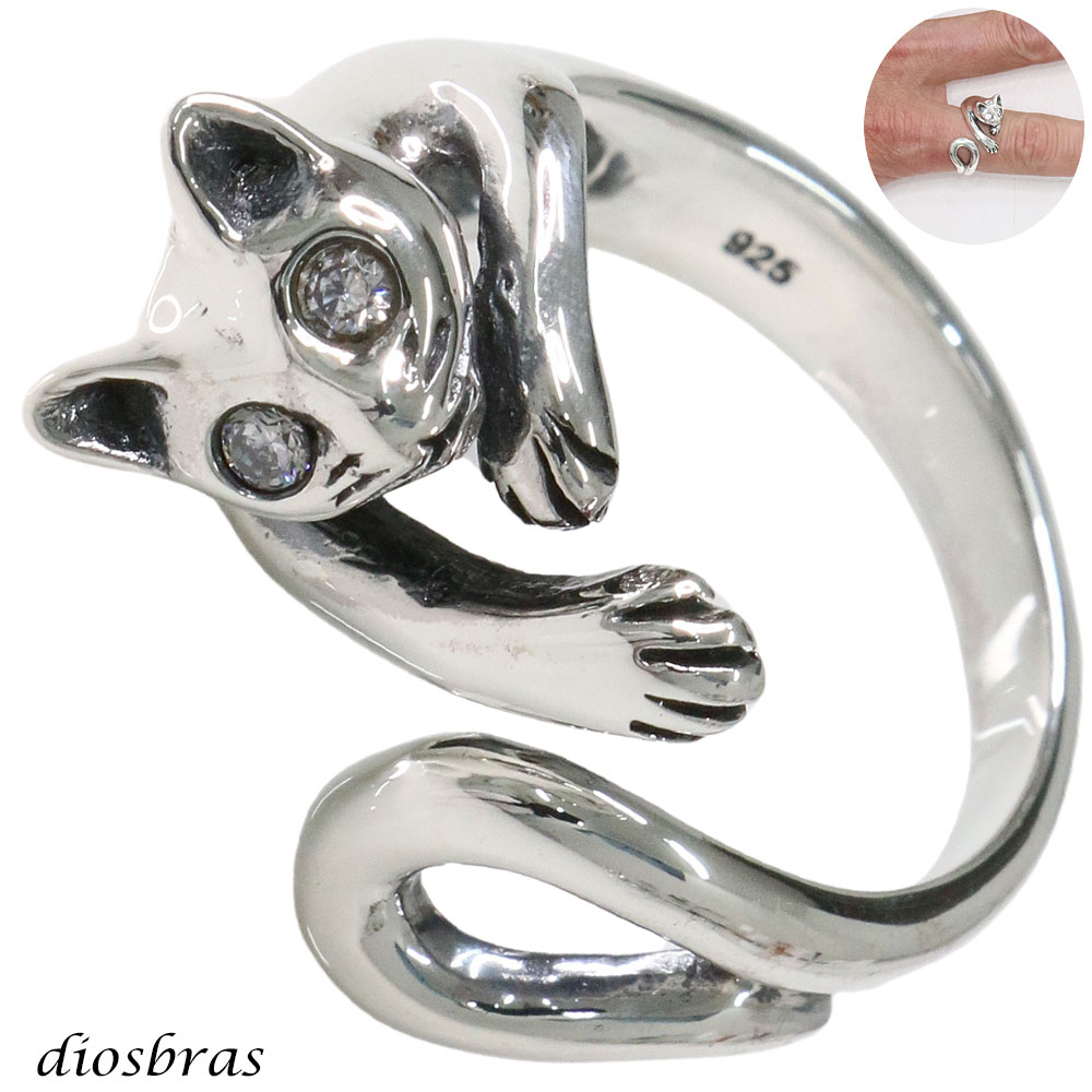 ネコ 巻き付き 猫 フリーサイズ リング ジルコニア シルバー925 シルバーリング メンズ レディース ホワイト シンプル スターリングシルバー ゴシック 指輪 ring silver925 銀 シルバーアクセサリー 男性 女性 レディース シンプル ピンキー