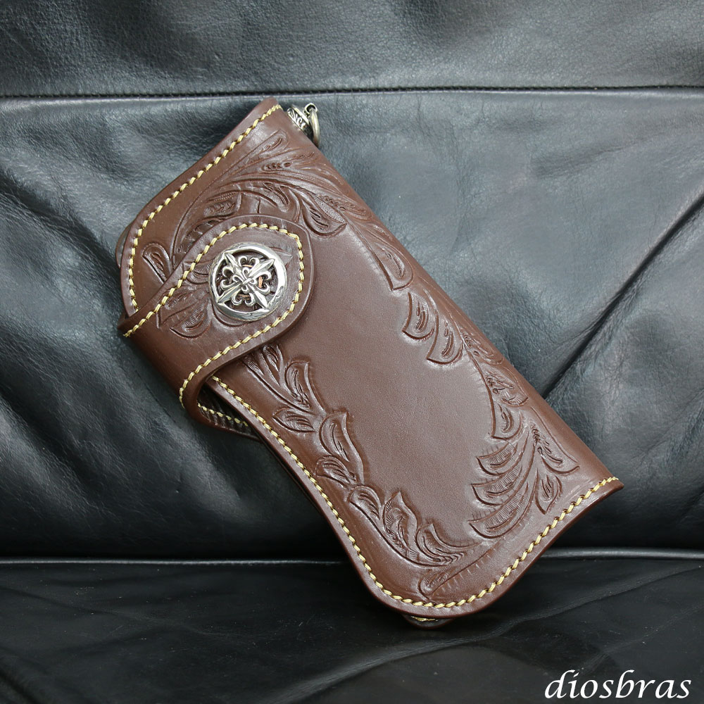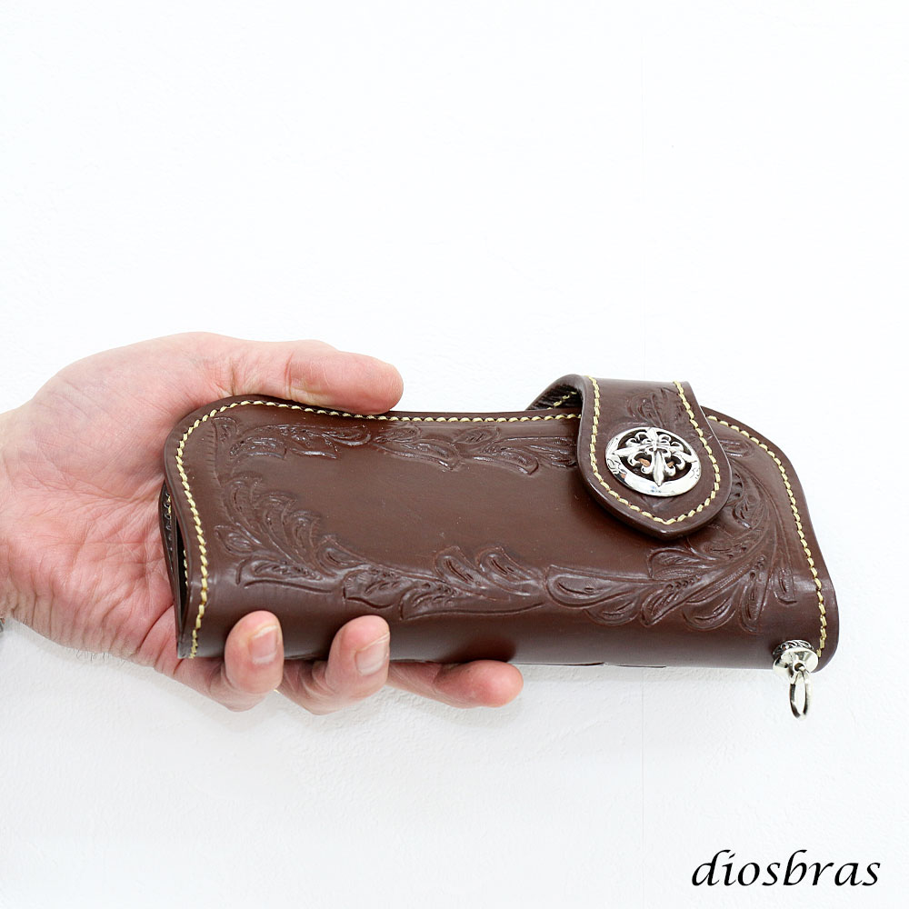 【diosbras-ディオブラス】本革サドルレザーカービングウォレット アラベスク カービングバイカーズウォレット 長財布/ロングウォレット 牛革財布 シルバー925コンチョヌメ革サイフwallet【CG】 [LWC-3-DBRM]