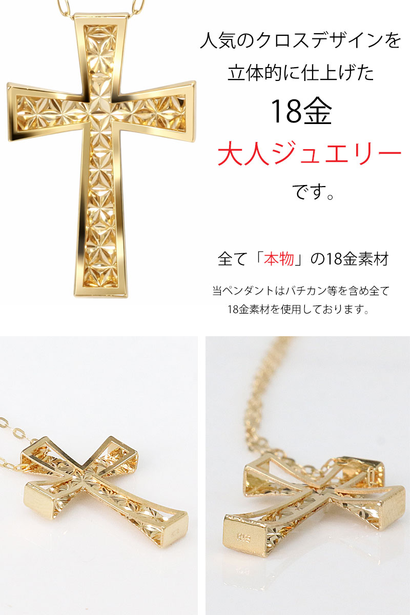 日本製 クロス 十字架 立体構造 ペンダント トップ k18 ダイヤモンドカット スターカット 菊花彫り チェーン付き 放射状幾何学模様 シンプル ゴールド 18k メンズ レディース クロスペンダント 18金 チャーム アズキチェーン 長あずきチェーン 小豆チェーン ネックレス